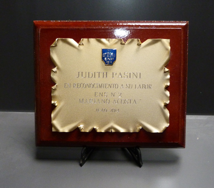 Plaqueta de metal dorada o plateada sobre base de madera.