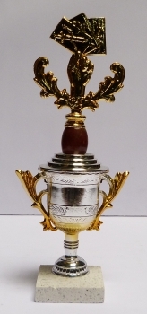 Trofeo copa de plástico con alegoría portacentro y base de marmol.